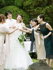 千秋の杜ウエディングの魅力は、活用次第で純和風と洋風、両方のスタイルを取り入れられること。例えば、彌高神社での挙式は白無垢を、披露宴では振袖やドレスをというように組み合わせも自由自在。また、純和風庭園で洋風スタイルのパーティを行うなどの個性ある演出もできます。緑に映えるウエディングドレス姿は室内とはまた違った印象に。シャンパンなどを置けば、ウエルカムドリンクを提供するコーナーにもなります。