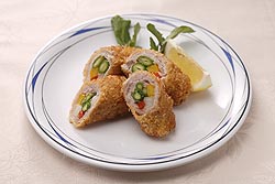 - 全粒粉小麦粉、溶き卵、全粒粉パン粉の順に衣をつけ、180度の油で揚げる。