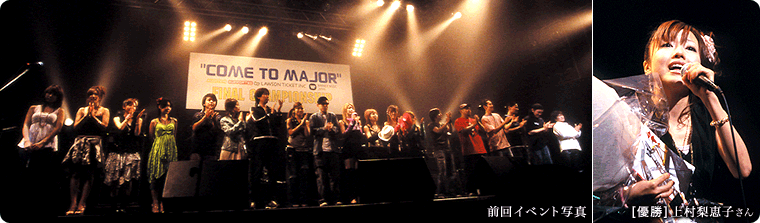 2004年7月15日にスタートし、約1年をかけて行われた「COME TO MAJOR 第一弾」。その優勝者決定イベント「COME TO MAJOR FINAL CHAMPIONSHIP」が、今年5月10日にShibuya O-Eastで開催されました。当日はデビューアーティスト決定の瞬間を見ようと満員のオーディエンスで大盛況、ファイナリスト10組は最高のライブパフォーマンスを披露しました。